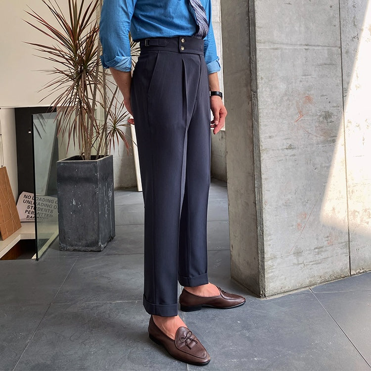 Unsere kultige Gurkha-Passform zeichnet sich durch eine hohe und halbschmale Passform, einen breiten, verlängerten 2-Knopf-Gürtel, seitliche Verstellmöglichkeiten und einzelne Falten aus.